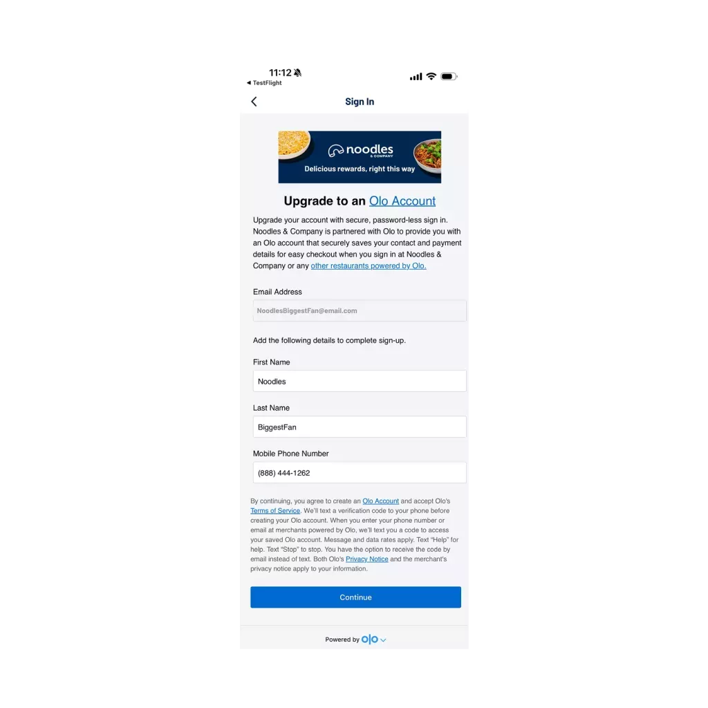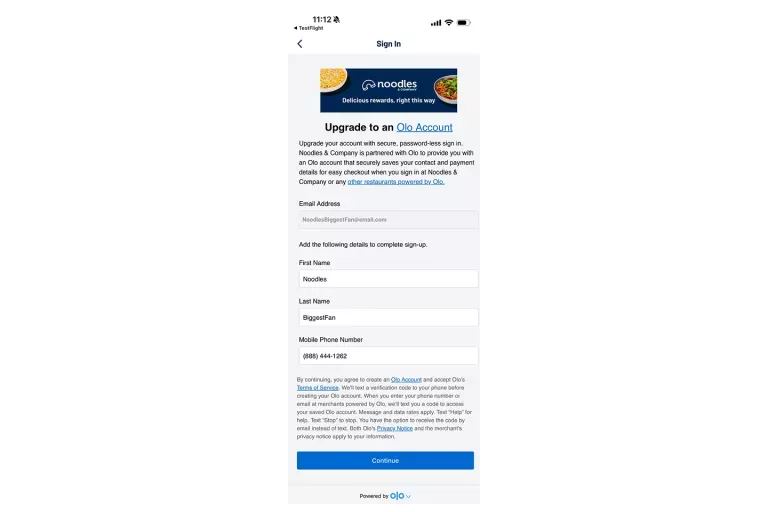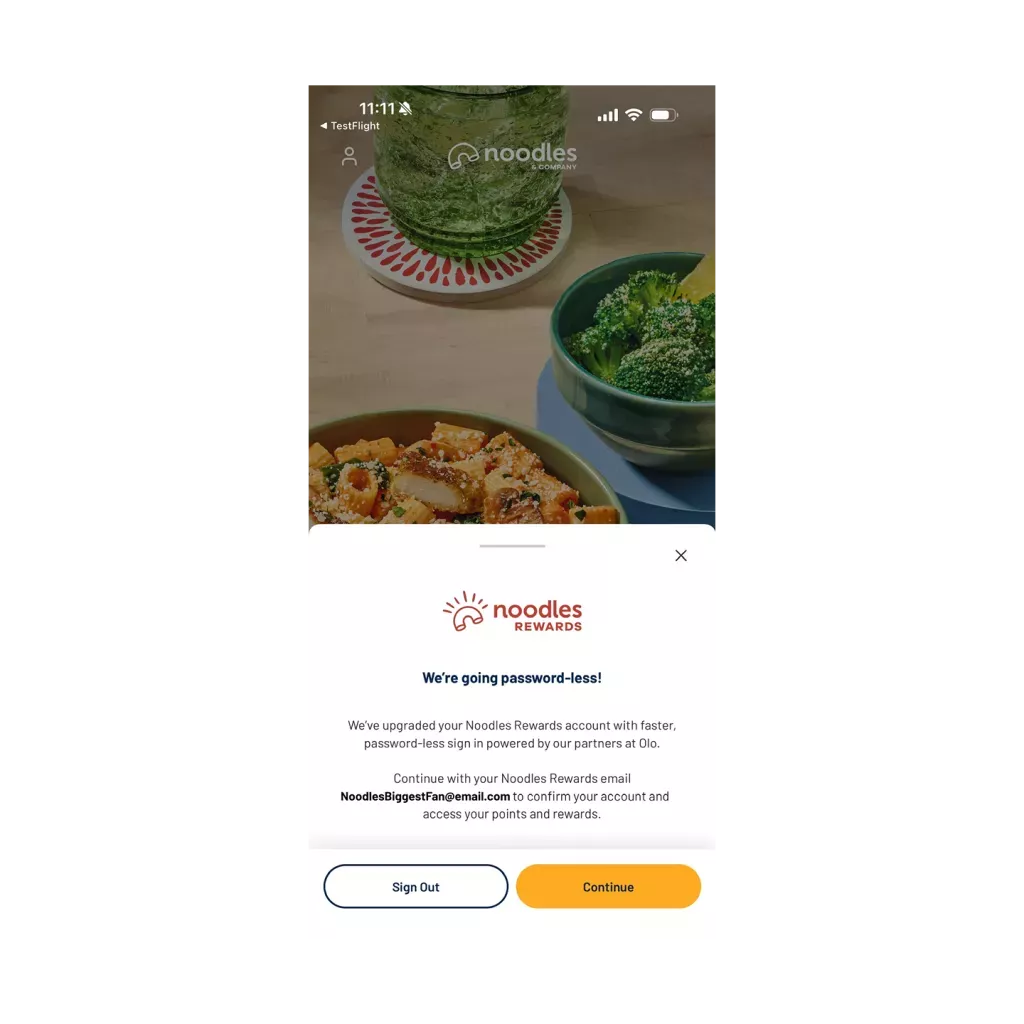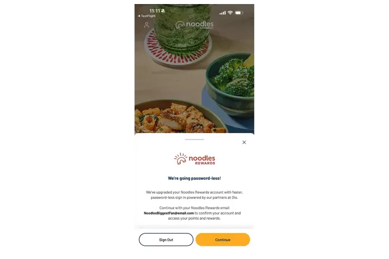 Click continue to agree to logging in with your current Noodles Rewards account.