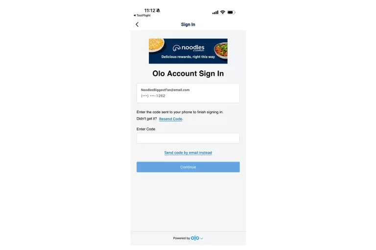 A code validation will be sent automatically to your phone. If you don't get a code within two minutes, you can either resend the code to your phone number or click "Send code by email instead" to have that code sent to the email associated with your account. It is required to validate the code by email or phone in order to access your account. Enter in the code sent to your phone or email and then select "Continue" to access your Noodles Rewards account.