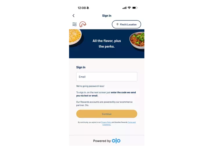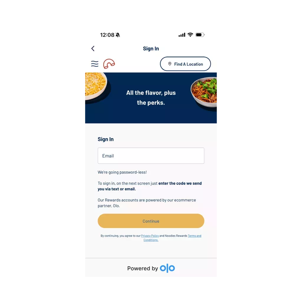 Enter in the email associated with your current Noodles Rewards account to sign in.