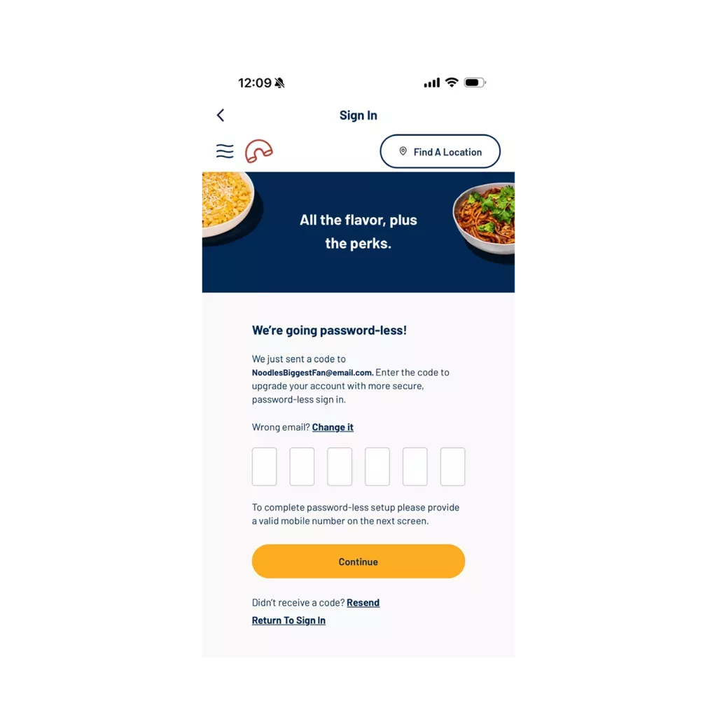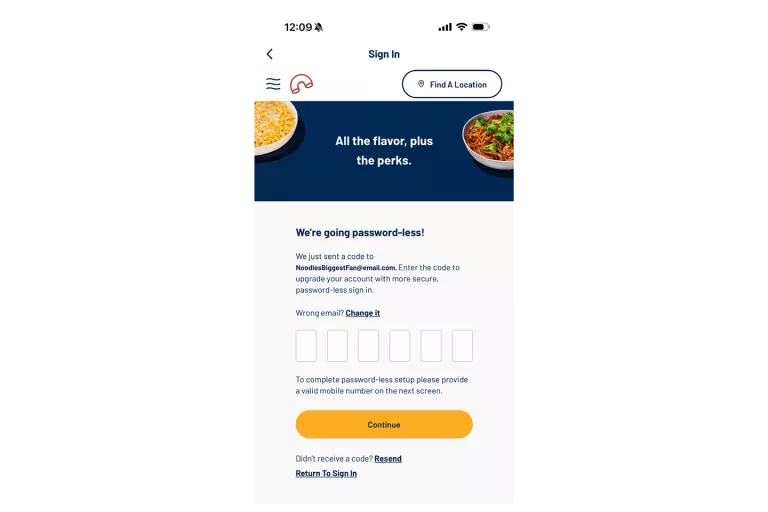 A code validation will be sent automatically to your phone. If you don't get a code within two minutes, you can either resend the code to your phone number or click "Send code by email instead" to have that code sent to the email associated with your account. It is required to validate the code by email or phone in order to access your account. Enter in the code sent to your phone or email and then select "Continue" to access your Noodles Rewards account.