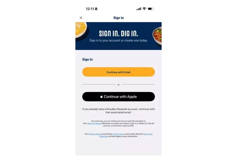 If you already have an email with your Noodles Rewards account, select "Continue With Email". This step is important to ensure that you get logged in with your associated Rewards account.